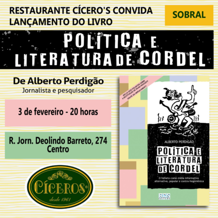 O livro Política e Literatura de Cordel – o folheto de política como mídia informativa alternativa, popular e contra-hegemônica (RDS, 2022, 352 p.), do jornalista Alberto Perdigão, será lançado em Sobral, nesta sexta-feira (3), às 20 horas, no restaurante Cícero’s. A obra discute a poesia-reportagem como alternativa à notícia da grande mídia e analisa as narrativas do cordel sobre a destituição da presidente Dilma Rousseff, ocorrida em 2016.