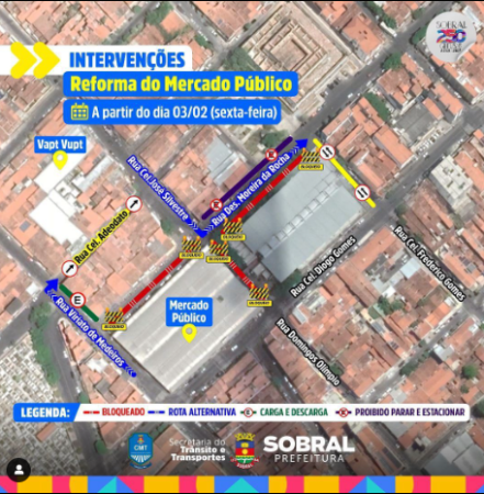 A Secretaria do Trânsito e Transportes (Setran), por meio da Coordenadoria Municipal de Trânsito (CMT), informa que serão realizadas novas intervenções no trânsito das vias no entorno do Mercado Público de Sobral, no Centro, a partir desta sexta-feira (03/02).