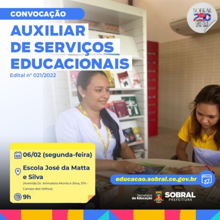 A Secretaria da Educação de Sobral está convocando novos aprovados na seleção pública para o cargo de auxiliar de serviços educacionais (edital nº 21/2022). A lotação será realizada na segunda-feira (06/02), às 9h, na Escola José da Matta e Silva, localizada na Avenida Dr. José Arimateia Monte e Silva, 574, Campo dos Velhos, conforme o termo de convocação.