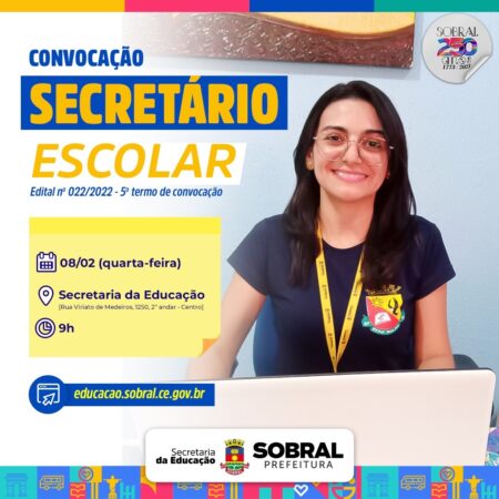 A Secretaria da Educação de Sobral está convocando mais aprovados na seleção pública para secretários escolares (edital nº 022/2022). A lotação será realizada na quarta-feira (08/02), às 9h, na Secretaria da Educação, localizada na Rua Viriato de Medeiros, 1250, 2º andar – Centro.