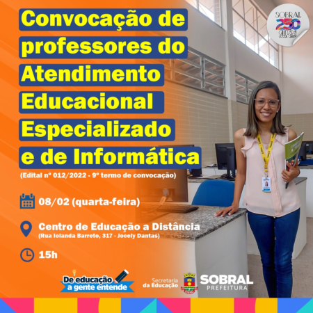 A Secretaria da Educação de Sobral está convocando novos professores de Atendimento Educacional Especializado (AEE) e de Informática Básica, aprovados na seleção pública de professores temporários (edital nº 12/2022). A lotação será realizada na quarta-feira (08/02), às 15h, no auditório do Centro de Educação a Distância, localizado na Rua Iolanda P. C. Barreto, 317 – Jocely Dantas.