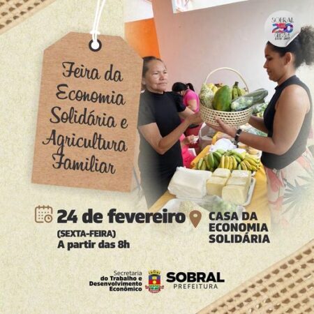 Se liga, sobralense! Nesta sexta-feira (24/02) tem Feira da Economia Solidária e Agricultura Familiar, a partir das 8h, na Casa da Economia Solidária de Sobral. Venha garantir peças de artesanato e alimentos sem agrotóxicos como frutas, doces, mel e muito mais!