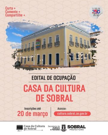 O Edital seleciona propostas nas áreas de artes visuais, patrimônio cultural e memória, artes cênicas e performativas, audiovisual, literatura, circo, música, dança e moda, entre outras, para ocupação cultural da Casa da Cultura de Sobral.