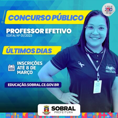 As inscrições para o concurso público para professor de educação básica, realizado pela Prefeitura de Sobral, por meio das secretarias da Educação (SME) e do Planejamento e Gestão (Seplag), encerram nesta quarta-feira (08/03) e acontecem exclusivamente pela internet, no site do concurso (www.uece.br/cev). Ao todo, serão oferecidas 700 vagas.