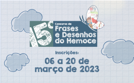 Estão abertas as inscrições para o 15º Concurso de Frases e Desenhos, promovido pelo Centro de Hematologia e Hemoterapia do Ceará (Hemoce). As escolas das redes de ensino pública e privada no Estado podem realizar a inscrição até o dia 20 de março, AQUI (https://bit.ly/3Jic5gS) e no site do hemocentro (AQUI – https://bit.ly/3ZGcsaq). Os trabalhos selecionados irão compor o calendário de 2024 do equipamento vinculado à Secretaria da Saúde do Ceará (Sesa).