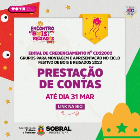 A Prefeitura de Sobral, por meio da Secretaria da Cultura e Turismo (Secult), anuncia o início da prestação de contas dos proponentes selecionados no Edital de Credenciamento Nº CD22002 para montagem e apresentação no ciclo festivo de Bois e Reisados 2023. A prestação de contas fica disponível até 23 de abril na plataforma Mapa Cultural.
