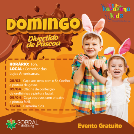 A sua diversão já tem local garantido! O Sobral Shopping está com uma mega programação para os “Domingos Divertidos de Páscoa”. Serão quatro domingos com muitas brincadeiras, alegria e diversão, por isso você não pode perder essa oportunidade! Confira a nossa programação!
