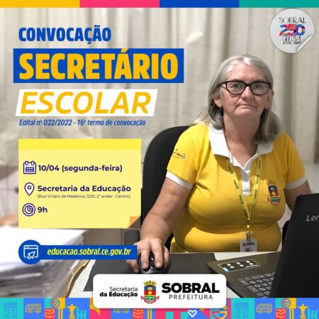 A Secretaria da Educação de Sobral está convocando novos aprovados na seleção pública para secretários escolares (edital nº 022/2022). A lotação será realizada na segunda-feira (10/04), às 9h, na Secretaria da Educação, localizada na Rua Viriato de Medeiros, 1250, 2º andar – Centro.