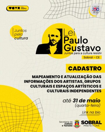 A Prefeitura de Sobral, por meio da Secretaria da Cultura e Turismo (Secult) e do Comitê Municipal de Acompanhamento da Lei Paulo Gustavo, lançou, nesta terça-feira (18/04), o cadastro para mapeamento e atualização das informações dos artistas, grupos culturais e espaços artísticos e culturais independentes de Sobral.