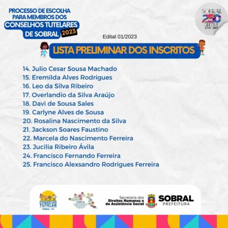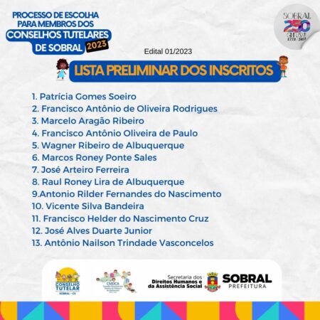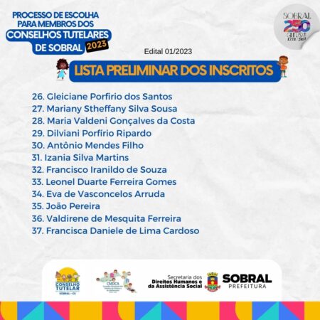 37 pessoas se inscreveram visando ocupar uma das 10 vagas de conselheiro tutelar do município de Sobral, para o período de 2024 a 2028.