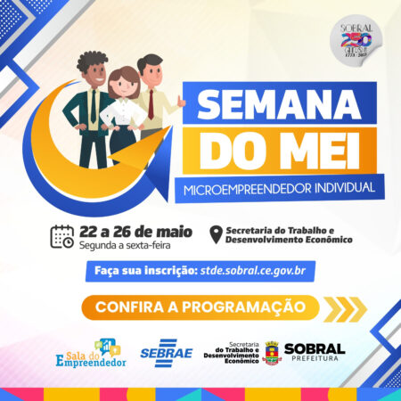 A Prefeitura de Sobral, por meio da Secretaria do Trabalho e Desenvolvimento Econômico (STDE), irá promover a Semana do Microempreendedor Individual de 22 a 26 de maio. A programação contará com oficinas, rodas de conversa, atendimentos e tira-dúvidas, na sede da STDE, localizada na Avenida Lúcia Saboia, 215, centro.