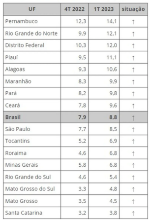 A taxa de desemprego no Brasil subiu em 16 das 27 Unidades da Federação no primeiro trimestre de 2023, segundo a Pesquisa Nacional por Amostra de Domicílios (PNAD) Contínua Trimestral, divulgada nesta quinta-feira (18) pelo Instituto Brasileiro de Geografia e Estatística (IBGE). Nos demais estados, a taxa ficou estável.