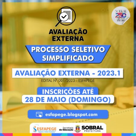 A Secretaria da Educação de Sobral e a Escola de Formação Permanente do Magistério e Gestão Educacional (Esfapege) abriram inscrições para a seleção de candidatos para a aplicação da Avaliação Externa 2023.1 das escolas municipais de Sobral. As inscrições são gratuitas e os interessados poderão se inscrever até domingo (28/05), exclusivamente pela internet.
