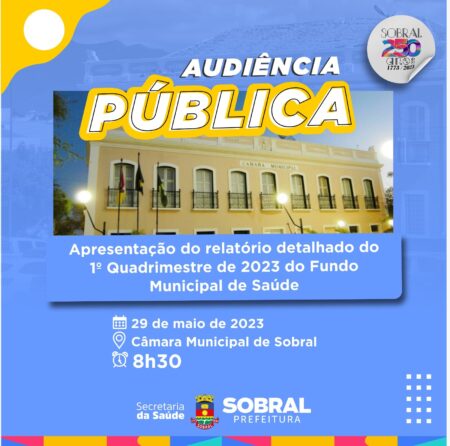 A Prefeitura de Sobral, por meio da Secretaria da Saúde, realizará, no dia 29 de maio (segunda-feira), às 8h30, uma audiência pública para apresentação do relatório detalhado do primeiro quadrimestre de 2023 do Fundo Municipal de Saúde.