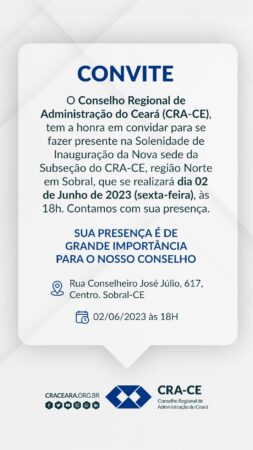 O Conselho Regional de Administração do Ceará inaugura a nova sede da Subseção do CRA-CE / Região Norte, em Sobral, nesta sexta-feira, 2 de Junho, às 18h. O evento contará com a presença do presidente do CRA-CE, administrador Rogério Cristino. A administradora Suilany Teixeira, que também é a coordenadora do escritório regional do Sebrae, em Sobral, será a nova delegada regional.
