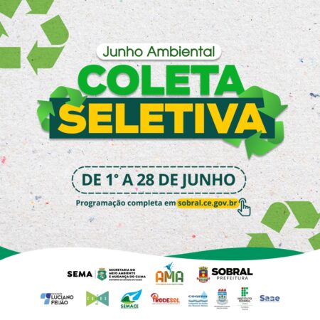 A Prefeitura de Sobral promoverá, durante o mês de junho, comemorações alusivas ao Dia Mundial do Meio Ambiente: o “Junho Ambiental”, com o tema “Coleta Seletiva e Sustentabilidade”. Serão realizadas diversas ações de educação pela cidade, com o objetivo de divulgar, promover sensibilização e potencializar as temáticas “coleta seletiva”, “sustentabilidade” e “meio ambiente”, de forma integrada e intersetorial.