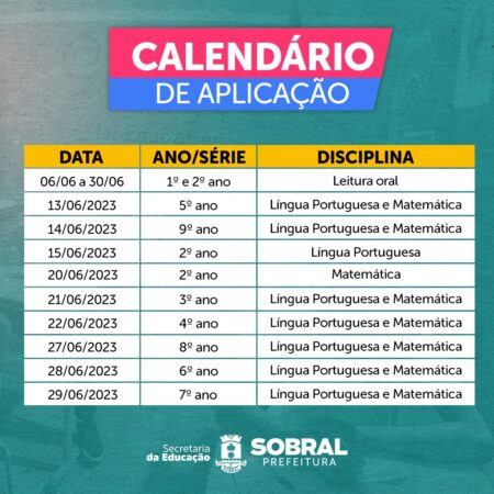 A Secretaria da Educação de Sobral divulgou, nesta quinta-feira (01/06), o calendário das Avaliações Externas de 2023.1. As avaliações externas acontecerão entre os dias 6 a 30 de junho, em todas as 55 escolas de Ensino Fundamental I e II de Sobral.