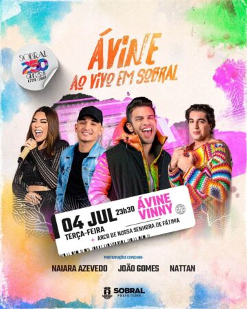 A Prefeitura de Sobral anunciou na noite deste domingo (4/6) mais um presente para o município, que comemora 250 anos de emancipação política no proximo dia 5 de Julho. O sobralense Avine Viny vai gravar seu novo DVD no Boulevard do Arco, com participações mais que especiais de Nattanzinho, João Gomes e Naiara Azevedo!!! O show começa logo após a apresentação de Caetano Veloso, na Arena Aeroporto.