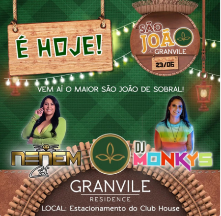 Pensando em uma noite de comemoração com muito forró, boa música e grandes amigos, o promoter César Macedo convida você a se fazer presente no 1º São João do Granvile Residence, que acontece nesta sexta-feira, 23 de junho, a partir das 19h, no estacionamento do Clube House, do condomínio localizado no pé da serra da Meruoca.
