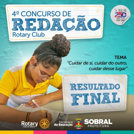 A Secretaria da Educação de Sobral divulgou, nesta quinta-feira (22/06), o resultado final do 4º Concurso de Redação do Rotary Club, que este ano teve como tema “Cuidar De Si, Cuidar Do Outro, Cuidar Desse Lugar”. Participaram do concurso estudantes regularmente matriculados no 9º ano do Ensino Fundamental das escolas municipais de Sobral.
