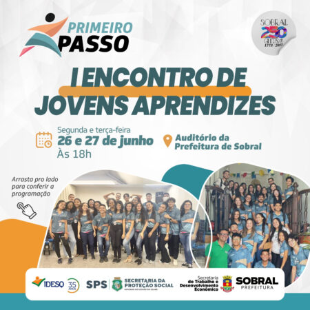 A Prefeitura de Sobral, por meio da Secretaria do Trabalho e Desenvolvimento Econômico (STDE), realizará o 1º Encontro de Jovens Aprendizes, nos dias 26 e 27 de junho (segunda e terça-feira), a partir das 18h, no auditório da Prefeitura de Sobral. O evento marcará o encerramento do projeto referente à edição de 2021/2022 e de 2022/2023, que teve duração de 11 meses e contemplou jovens entre 14 a 22 anos.
