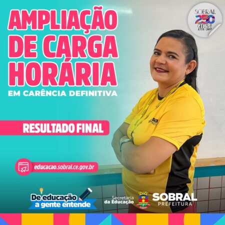 A Secretaria da Educação de Sobral divulgou o resultado final da suplementação de carga horária (ampliação temporária) em carência definitiva (edital nº 007/2023) de professores para as escolas públicas municipais de Sobral.