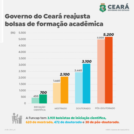 Como forma de incentivar a pesquisa científica no Estado, o governador Elmano de Freitas sancionou a Lei que reajusta o valor das bolsas acadêmicas. Com isso, o investimento do Governo do Ceará passa a ser de cerca de R$ 67 milhões por ano em bolsistas em iniciação científica, mestrado, doutorado e pós-doutorado, que somam mais de 5 mil.