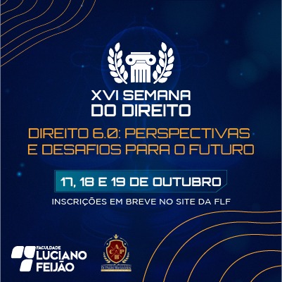 A Faculdade Luciano Feijão através da coordenação do curso de Direito tem um convite especial pra você! A XVI Semana do Direito vem aí trazendo uma nova abordagem da área da justiça com o tema “Direito 6.0: perspectivas e desafios para o futuro”. ⚖️ Então já salva a data, de 17 a 19 de outubro, e participe dessa semana que promoverá debates instigantes e importantes para a área do Direito. Fica ligado, as inscrições abrirão em breve!