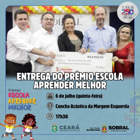 A Prefeitura de Sobral, por meio da Secretaria da Educação, reconhecerá, nesta quinta-feira (06/07) com o prêmio Aprender Melhor os educadores e as escolas municipais que alcançaram as metas de aprendizagem estabelecidas para o ano de 2022. A partir das 17h30, o evento será realizado na Concha Acústica da Margem Esquerda.