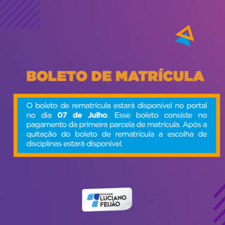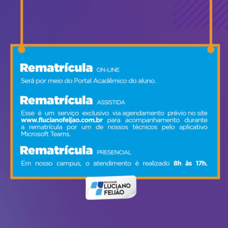 O período de rematrículas está chegando e você não vai querer perder o prazo. A rematrícula poderá ser realizada a partir de três modalidade: Online, Assistida ou Presencial, do dia 10 a 31 de julho. Mas fique atento, a rematrícula só poderá ser realizada após o pagamento da primeira parcela do semestre.
