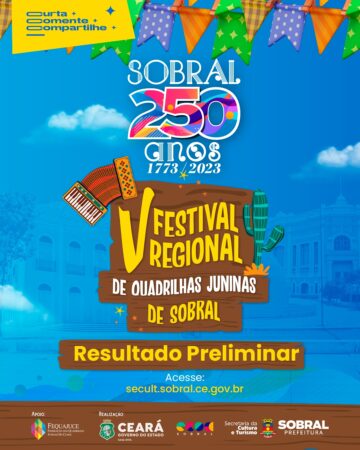 A Prefeitura de Sobral, por meio da Secretaria da Cultura e Turismo (Secult), divulgou o resultado preliminar da chamada pública para o V Festival Regional de Quadrilhas Juninas, que será realizado nos dias 20 e 21 de julho (quinta e sexta-feira), na Arena Aeroporto (Av. Comandante Maurocélio Rocha Pontes, 501 – Jerônimo Prado).