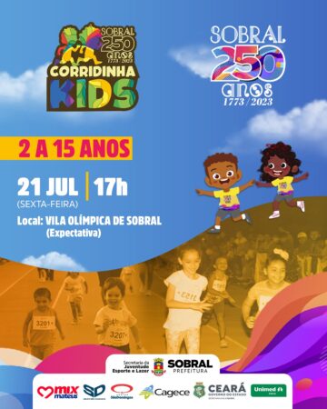 A Prefeitura de Sobral, por meio da Secretaria da Juventude, Esporte e Lazer (Secjel), realiza, na próxima sexta-feira (21/07), a partir das 17h, a Corridinha Kids, na Vila Olímpica de Sobral (Expectativa).