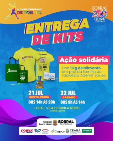 Unidos pela causa, pedimos a todos os corredores da Meia Maratona de Sobral que irão retirar seus kits, que levem um quilo de alimento não perecível para ajudar a família do radialista Ademir Sousa. Ele se encontra internado no hospital IJF, em Fortaleza, após um acidente com um botijão de gás, que deixou grande parte do seu corpo ferido. Vamos juntos fazer a diferença e levar esperança e conforto a essa família em momento tão delicado. Sua contribuição pode fazer toda a diferença!