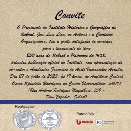 O Presidente do Instituto Histórico e Geográfico de Sobral, José Luís Lira, os Autores e a Comissão Organizadora, têm a grata satisfação de convidar para o lançamento do livro “250 anos de Sobral e Patronos do IHGS”, primeira publicação oficial do Instituto, com apresentação do có-autor e Acadêmico Francisco de Assis Vasconcelos Arruda. Dia 27 de julho de 2023, às 19 horas, no Auditório Central Oscar Spíndola Rodrigues do Centro Universitário UNINTA (Rua Antônio Rodrigues Magalhães, 359 – Dom Expedito, Sobral).