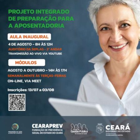 Neste ano, os encontros serão realizados de forma virtual, por meio do Google Meet. O objetivo é possibilitar que servidores de todos os municípios cearenses participem e se preparem para a aposentadoria. Apenas a aula inaugural, marcada para 4 de agosto, das 8h às 12h, ocorrerá de forma híbrida, com evento presencial no auditório da Seplag e transmissão pelo canal da secretaria no Youtube (AQUI). A iniciativa conta com a parceria da Escola de Gestão Pública do Estado do Ceará (EGPCE) e da Fundação de Previdência Social do Estado do Ceará (Cearaprev).