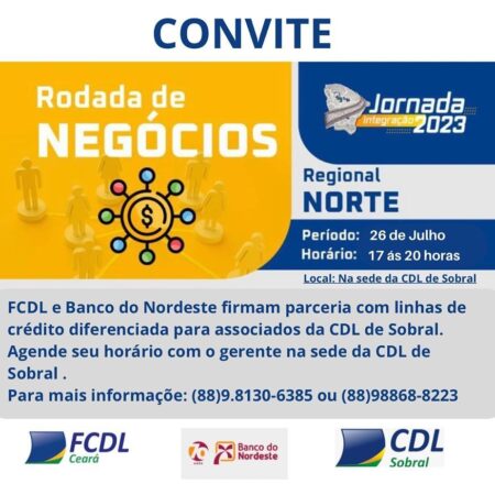A Federação das CDL’s do Ceará, em parceria com o Banco do Nordeste, estão disponibilizando condições especiais para associado da CDL de Sobral participarem da Rodada de Negócios, que acontece nesta quarta-feira (26/7), das 17h as 20h, na sede da associação lojista, na Rua Dr. João do Monte, ao lado do Saae. As vagas são limitadas, e maiores informações podem ser obtidas pelo telefone (88) 3677.1037