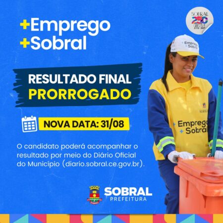 A Prefeitura de Sobral anunciou nova data para a divulgação do resultado final do processo seletivo do programa “Mais Emprego, Mais Sobral” para o dia 31 de agosto (quinta-feira).
