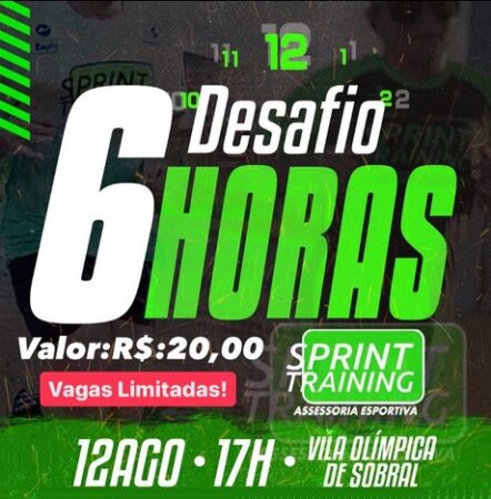A Sprint Training, assessoria de corrida comandada pelos competentes Celso Trindade e Wladir Rodrigues lançou nessa semana o Desafio 6 Horas de Corrida, que acontece no próximo dia 12 de Agosto, na Vila Olímpica de Sobral. O início do evento acontece as 17h, com previsão de término as 23h. Informações podem ser obtidas AQUI https://linktr.ee/SprintTraining