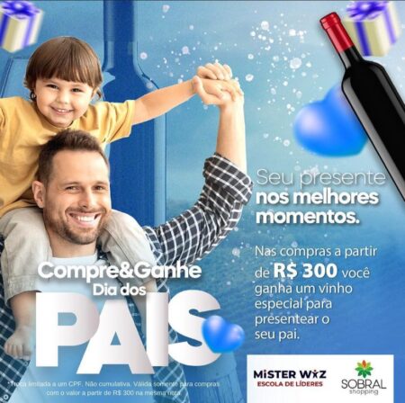 Neste Dia dos Pais você pode garantir um presente especial para aproveitar ao lado das pessoas que você ama aqui no Sobral Shopping! Nas compras a partir de R$ 300,00 você ganha um vinho especial para presentear seu pai! A campanha inicia nesta segunda-feira, 07 de agosto, e segue até durar o estoque Não perca essa grande oportunidade! Seu presente nos melhores momentos!