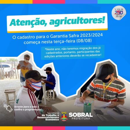 Começa, nesta terça-feira (8/8), o processo de cadastro de agricultores familiares no programa Garantia Safra 2023/2024. A ação inicia nos distritos de São Domingos, Ipueirinha e Jaibaras. O incentivo irá conceder aos cadastrados um auxílio em dinheiro de acordo com os reajustes anuais e irá contemplar produtores rurais de 43 localidades. O calendário de cadastramento deve ser conferido no final desta matéria ou no perfil do Instagram da Secretaria do Trabalho e Desenvolvimento Econômico (STDE) @falastdesobral.