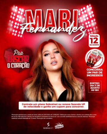 Bora para o Show da Mari Fernandez, dia 12 de agosto, no Coqueiros Clube? A Sobralnet leva você! O sorteio será sexta, 11/08, às 18h, pelo Instagram da Sobralnet.
