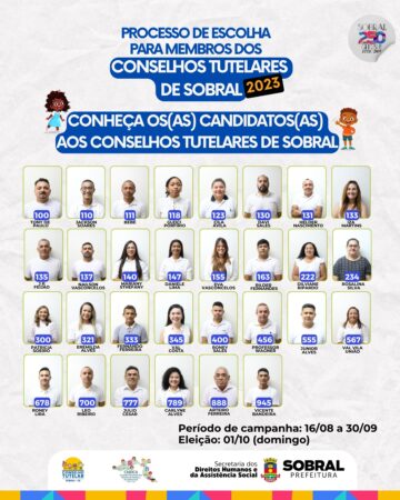 Começou, nesta quarta-feira (16/08), em Sobral, a campanha dos candidatos a ocupar as funções de conselheiros tutelares a partir de 2024. O período vai até o dia 30 de setembro (sábado) e a eleição será realizada no dia 1º de outubro (domingo).