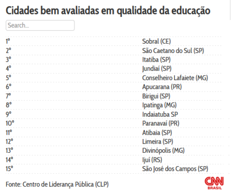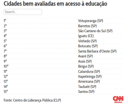 Os dados são do Ranking de Competitividade dos Municípios de 2023, feito pelo Centro de Liderança Política (CLP), em parceria com a Gove e a Seall. O estudo foi antecipado com exclusividade para a CNN nesta quarta-feira (23/8).