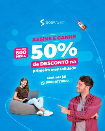 Navegue, transmita e jogue no seu ritmo com a conexão Sobralnet! Ganhe 50% de desconto na primeira mensalidade do plano de 600 MEGA! Não perca essa oportunidade, pois a promoção é por tempo limitado. ⚠️