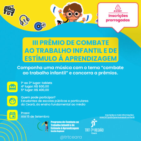 As inscrições do III Prêmio de Combate ao Trabalho Infantil e de Estímulo à Aprendizagem foram prorrogadas. Essa edição vai premiar as melhores músicas inéditas, dos mais variados gêneros, produzidas por estudantes de escolas públicas e particulares do estado do Ceará, do ensino fundamental ao médio. As inscrições foram prorrogadas e vão até às 23h59 do dia 15 de setembro. Os interessados podem se inscrever de forma gratuita pelo site do Tribunal Regional do Trabalho da 7ª Região: www.trt7.jus.br/premiotrabalhoinfantil.