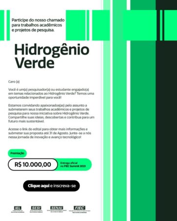 A Federação das Indústrias do Estado do Ceará – FIEC, o SENAI – Serviço Nacional de Aprendizagem Industrial, o SESI – Serviço Social da Indústria e Instituto Euvaldo Lodi – IEL, tornam público o Edital para seleção de Trabalhos Acadêmicos e Projetos de Pesquisa em Hidrogênio Verde, nas áreas da produção, armazenagem, transporte, distribuição, certificação, utilização e segurança em processos do Hidrogênio Verde e seus derivados, convidam os interessados a se inscreverem em conformidade com os termos estabelecidos neste certame.