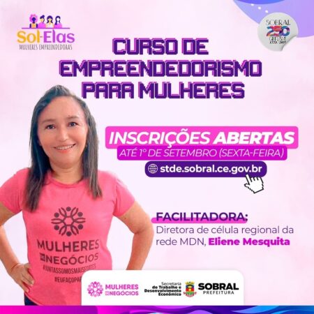 A Secretaria do Trabalho e Desenvolvimento Econômico (STDE), por meio do projeto Sol-Elas, está com inscrições abertas, até 1° de setembro (sexta-feira), para o curso de empreendedorismo, somente para mulheres, em parceria com o grupo Mulheres de Negócios. Estão sendo ofertadas 20 vagas e para participar, a interessada deve preencher o formulário disponibilizado no final desta matéria.