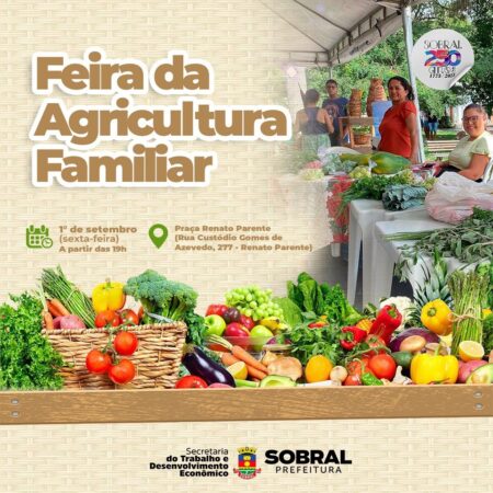 No dia 1º de setembro (sexta-feira), a Secretaria do Trabalho e Desenvolvimento Econômico (STDE) realizará a Feira da Agricultura Familiar, a partir das 19h, na Praça Renato Parente. O evento contará com a participação de agricultores familiares da sede e dos distritos com o objetivo de estimular a venda de produtos oriundos da agricultura familiar.
