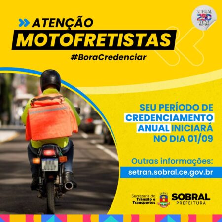 A partir da última sexta-feira (1º/09), a Prefeitura de Sobral, por meio da Secretaria do Trânsito e Transportes (Setran), iniciou o processo de credenciamento destinado aos profissionais atuantes no serviço comunitário de rua, conhecidos como motoboys, e no transporte de mercadorias, denominados motofretistas.