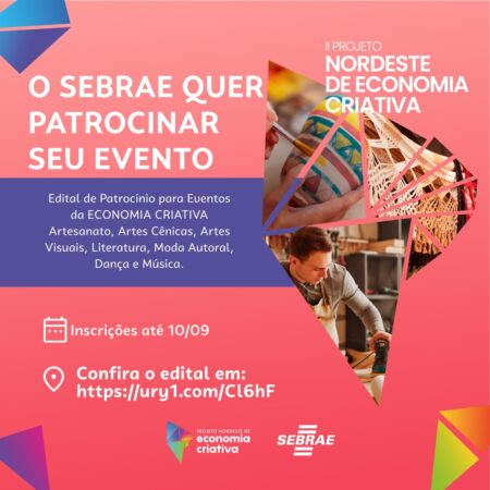 Estão abertas as inscrições para a seleção pública de patrocínio do Sebrae/CE para apoiar a realização de eventos presenciais ou híbridos na área da Economia Criativa. Os interessados têm até o dia 10 de setembro para formalizar sua inscrição para habilitação dos proponentes. A habilitação deve ser feita exclusivamente por meio do endereço eletrônico economiacriativa@ce.sebrae.com.br.